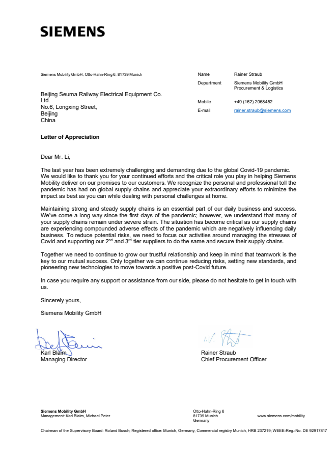 西門子交通有限公司CFO授予北京森瑪的感謝信
